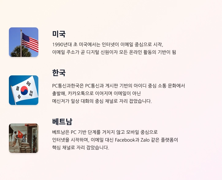 세 나라 모두 인터넷을 쓰지만, 출발점이 달랐기 때문에 채널의 무게 중심이 다릅니다.그래서 미국에서 자연스러운 이메일 활용 방식이 한국에서는 다르게 작동하고, 베트남에서는 익숙하지 않은 채널이 되는 것입니다. 같은 전략이 그대로 통하지 않는 이유가 여기에 있습니다.