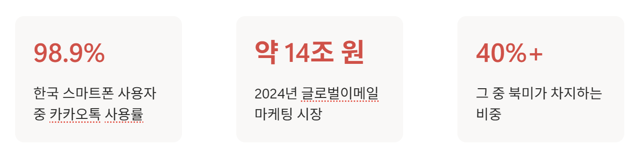 글로벌 이메일 마케팅 시장의 40% 이상을 북미가 차지하는 지금, 한국은 아직 국가별 독립 통계조차 별도 집계되지 않습니다. 그만큼 시장이 초기 단계라는 뜻이고, 역설적으로 지금 제대로 시작하는 사람에게 선점 기회가 있다는 뜻이기도 합니다.